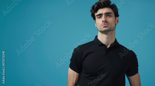 © Ayisha, Naklejka premium A man in a sleek black polo shirt, posing on a solid blue background.