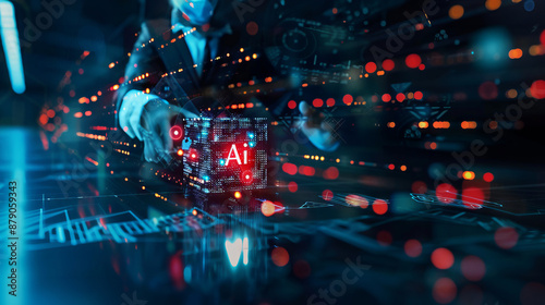 © Atchariya63, Obraz premium A man in a suit holds a glowing cube with the letters "AI" on it. The cube is surrounded by data and code, highlighting the power of artificial intelligence.