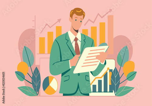 © GMZ, Obraz premium A man in a suit is looking at a piece of paper with numbers on it