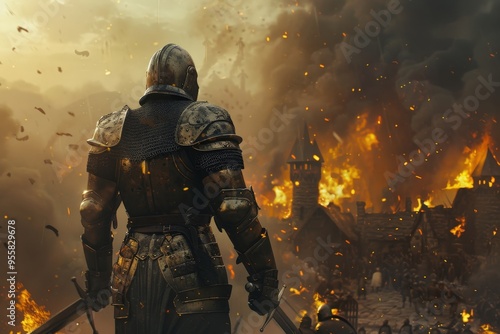 © shobakhul, Fototapeta premium A man in a suit of armor stands in front of a burning building, generative ai image