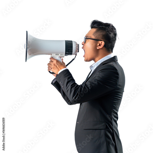 © soem, Fototapeta premium A man in a suit shouting into a megaphone.