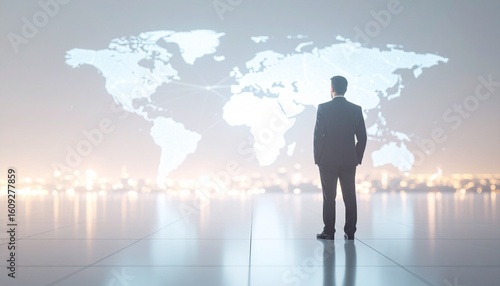 Fototapeta premium A man in a suit with a three-dimensional world map in the background