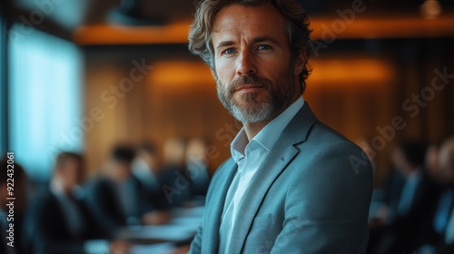 Fototapeta premium A man in a tailored suit stands confidently in a softly lit boardroom,...