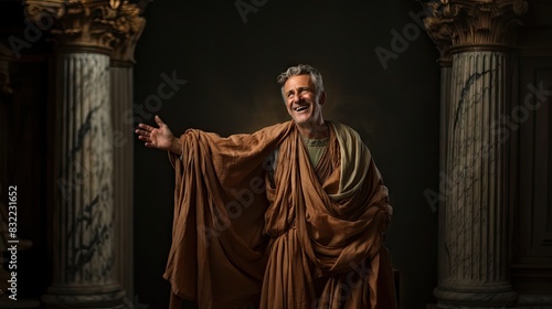© AS Photo Family, Naklejka premium A man in a toga strikes a pose reminiscent of a classical Roman orator against a dramatic backdrop with columns