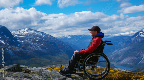 Fototapeta premium A man in a wheelchair enjoys a panoramic view of majestic mountains and a...