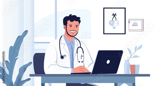 Fototapeta premium A man in a white lab coat is sitting at a desk with a laptop. He is smiling...