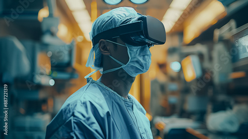 © CreativeIMGIdeas, Obraz premium A man in a white lab coat wearing a mask and a hat is looking at a computer screen