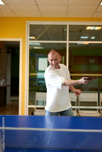 © amixstudio, Fototapeta premium A man in a white T-shirt enjoys playing table tennis. Friendly compete in ping pong club
