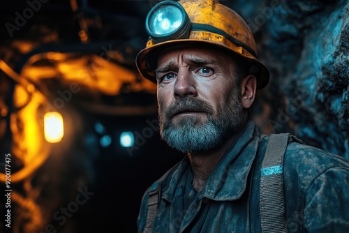 © At My Hat, Fototapeta premium A man in a yellow helmet is standing in a dark cave. He is looking at the camera with a serious expression