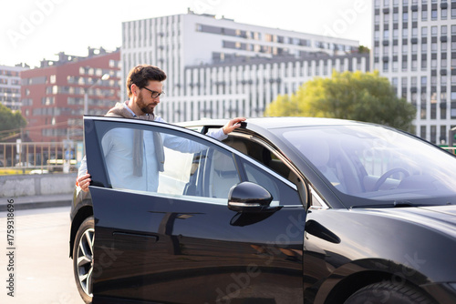 © sofiko14, Fototapeta premium A man in glasses opens the door of a sleek, black car, likely preparing to drive in an urban setting.