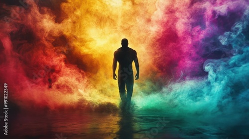© B 7 YOU, Fototapeta premium A man in silhouette stands in the middle of colorful smoke.