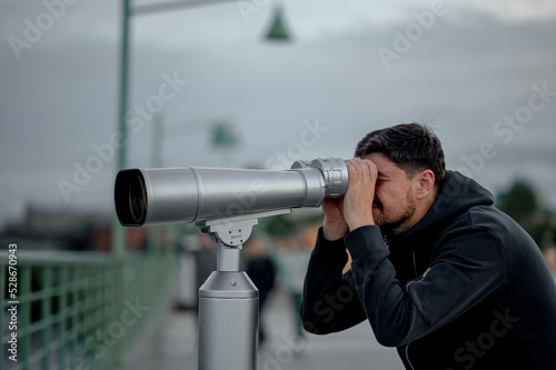 © Anastasia Amraeva, Obraz premium a man in the evening in the city looks at the sights with large binoculars
