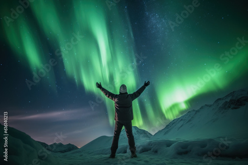 © เลิศลักษณ์ ทิพชัย, Fototapeta premium A man in the northern forest with a tent to see the beautiful green northern lights. Northern lights, mountains and winter ocean at night.Generative AI.