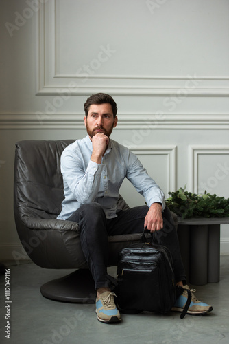 © Mykola, Fototapeta premium A man is comfortably sitting in a chair, resting with a leather backpack near him