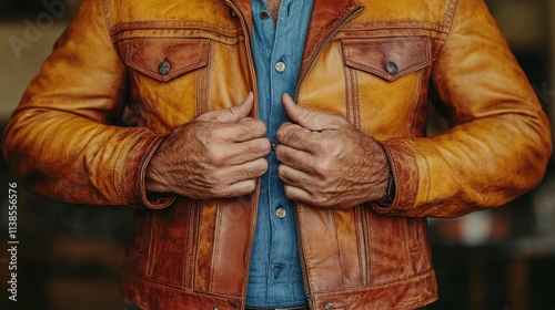 Fototapeta premium A man is fastening his brown leather jacket over a denim shirt, showing a...