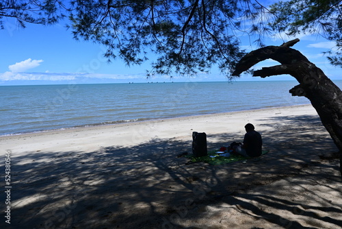 © Stock Medae , Fototapeta premium a man is having a picnic under a tree on the beach