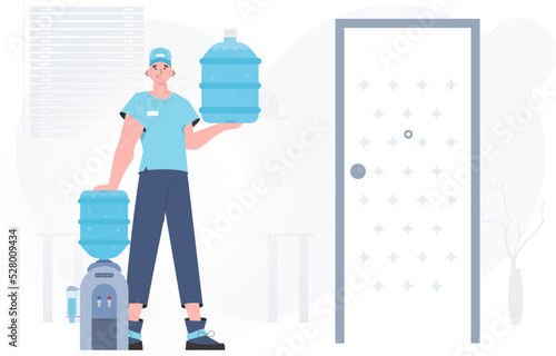 Obraz premium A man is holding a bottle of water. Delivery concept. Cartoon style character...