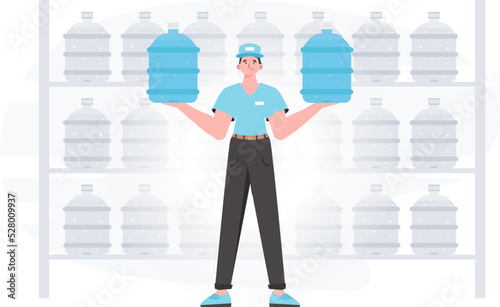 Obraz premium A man is holding a bottle of water. Delivery concept. The character is depicted in full growth. Vector illustration.
