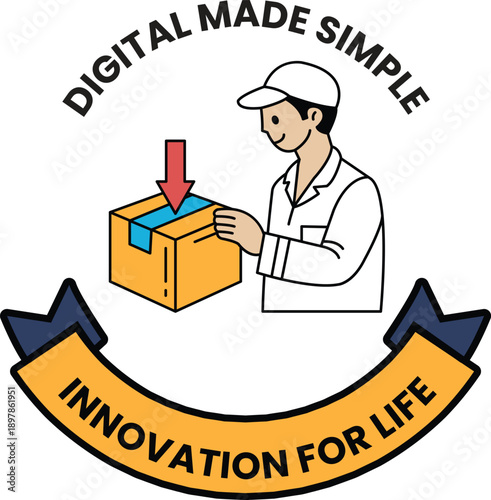 © toonsteb, Fototapeta premium A man is holding a box and the words "Digital Made Simple" are on the box