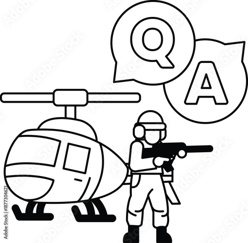 © toonsteb, Obraz premium A man is holding a gun and standing next to a helicopter