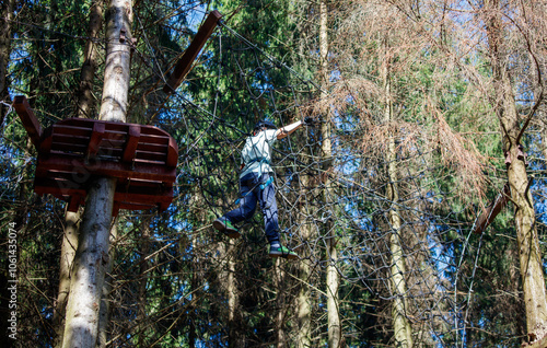 Fototapeta premium A man is jumping over a tree trunk on a rope course