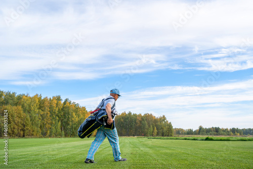 © Николай Амосеев, Obraz premium A man is leisurely walking on a beautiful golf course while carrying his golf equipment with him