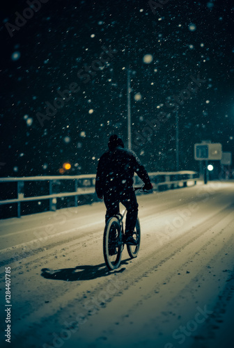 © Nikname, Obraz premium A man is riding a bicycle down a snowy street at night