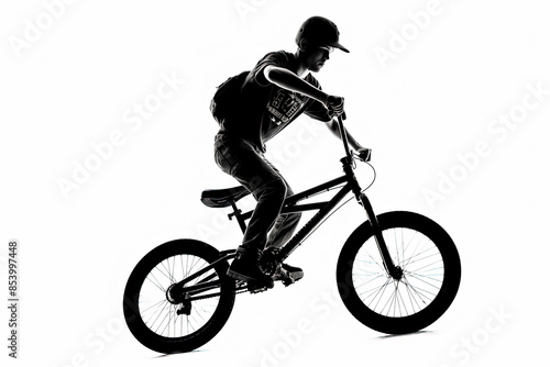 Fototapeta premium A man is riding a bike and doing a trick. The image is in black and white and...