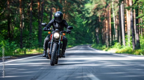 Fototapeta premium A man is riding a motorcycle down a road in a forest