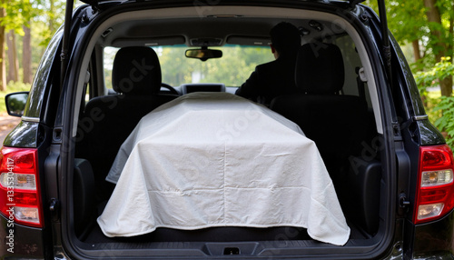 © Aleksandr, Fototapeta premium A man is sitting in a car with a coffin in the trunk, covered with a cloth