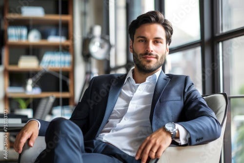 © pham, Fototapeta premium A man is sitting in a chair in front of a window, looking outside.