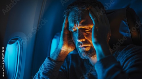 Obraz premium A man is sitting in an airplane with his head in his hands