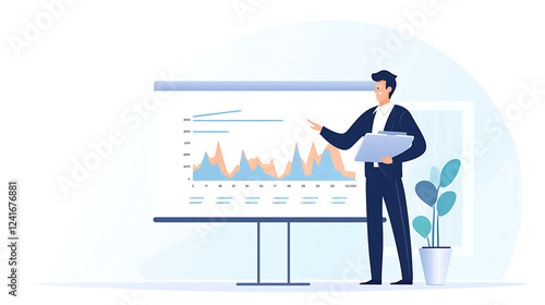 © Watcharin, Fototapeta premium A man is standing in front of a large projection screen, pointing to a graph