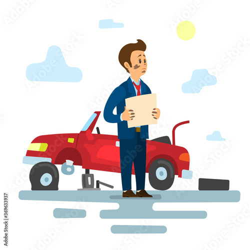 © Александр Сатиев, Obraz premium A man is standing near a broken car and needs help. Vector illustration with a red car on the road with a flat tire.