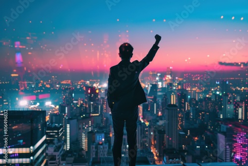 © Dusit, Fototapeta premium A man is standing on a rooftop in a city, holding his arms up in the air. The city skyline is visible in the background, and the sky is a mix of blue and purple
