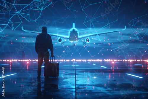 © mila103, Obraz premium A man is standing on a runway with a suitcase in front of an airplane