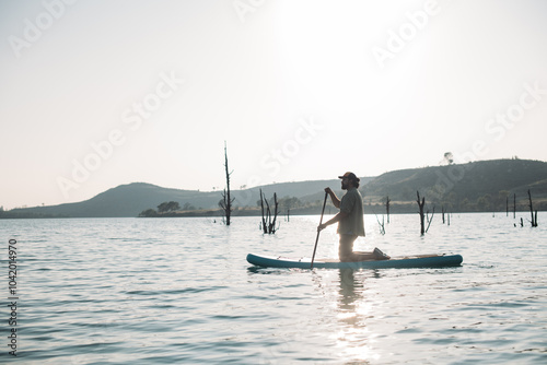 Naklejka premium A man is surfing on a sap board on calm water at sunset.