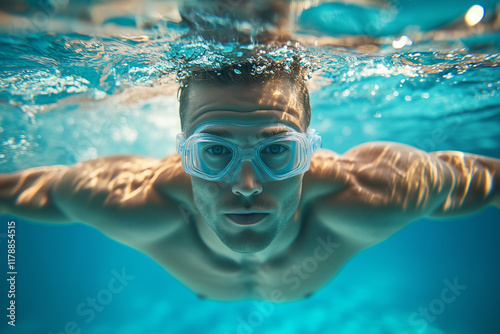 © Varitnan, Fototapeta premium A man is swimming in a pool with his arms outstretched. The water is clear and calm, and the man is focused on his strokes. Concept of determination and focus