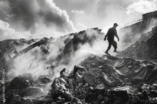 © Nico, Obraz premium A man is walking through a field of rocks and dirt