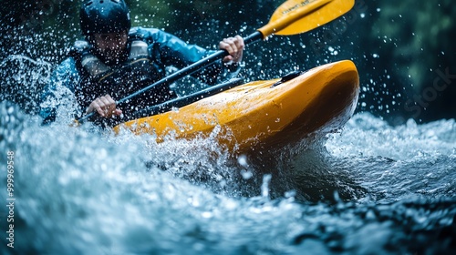 © Galib, Fototapeta premium A man kayaks through whitewater rapids.