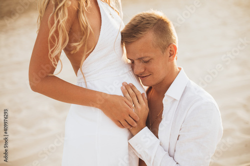 Fototapeta premium A man kisses his wife's pregnant belly.