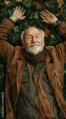 Naklejka premium A man lies on the ground, arms outstretched, looking up with a smile. AI.