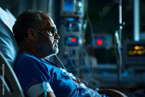 © Chanagun, Obraz premium a man lying in a hospital bed, looking pensive, connected to medical equipment, suggesting a serious health situation.