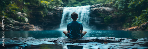 © Neural9 Project, Fototapeta premium A Man Meditates on a Rock, Facing a Cascading Waterfall in a Lush Forest