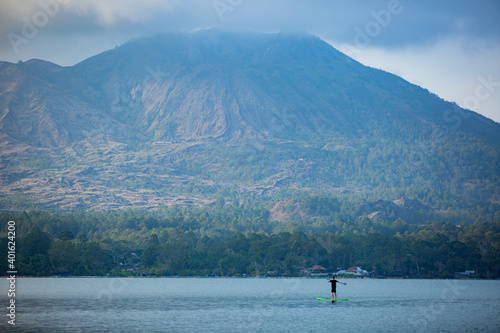 © alexzhilkin, Fototapeta premium a man on the lake ride a sup board. high quality photo