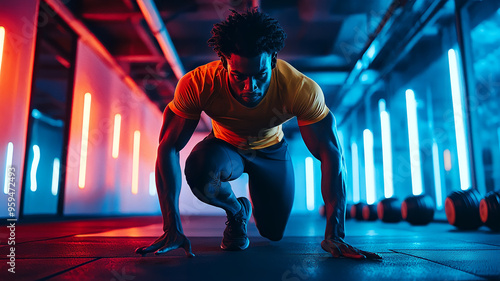 Fototapeta premium A man performing a high-intensity interval training workout in a spacious urban studio with vibrant colors and energetic atmosphere