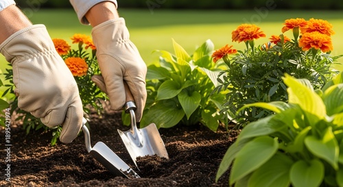 © Md, Fototapeta premium A man planting flowers and a young tree in a garden during a sunny day outdoors
