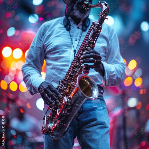 Fototapeta premium A man playing a saxophone, with bright red and blue lighting in the...