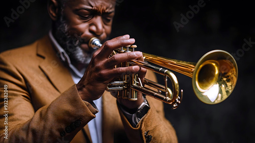 © Karen, Obraz premium A man playing the trumpet with intense focus, set against a dark, moody background, wearing a brown jacket.