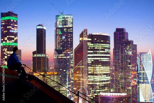 © maxim4e4ek, Obraz premium A man poses on the roof overlooking the city